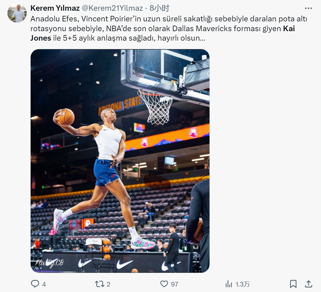 凯-琼斯和安纳多卢艾菲斯的合同包含NBA跳出条款,在2026年1月之后,如果他得到NBA合同,可以直接离开土耳其联赛。为啥这个时间要定在1月份?因为安纳多卢艾菲斯原来的内线文森特-普瓦里耶受伤,预计明年1月才能回归。
