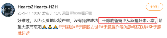 很快,便有网友曝光了于朦胧家人最新动态,称于朦胧爸妈也从新疆赶来北京来送别儿子。